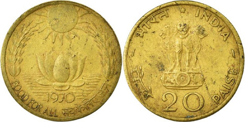 Initially issued brass , the Sun–Lotus 20 Paise coin circulated widely from the 1960s through the early 1970s. Due to inflation and reduced purchasing power, the denomination was eventually withdrawn from circulation, adding to its nostalgic and historical appeal.
